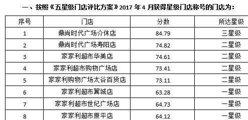 一、按照《五星级门店评比方案》2017年6月获得星级门店称号的门店为:序号门店分数所达星级1家家利超市孝义华美店73.37二星级2家家利购物广场太谷店70.99二星级3家家利超市楼东店71.3...